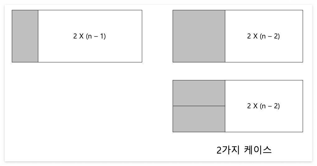 이 문제에서는 2 X 2 타일이 생겼기 때문에 맨 왼쪽에 2칸짜리 타일을 채우는 경우가 2개가 나온다.