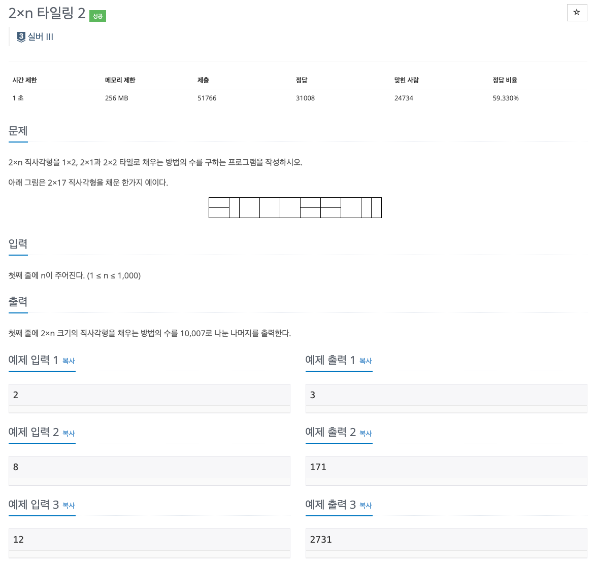 2×n 직사각형을 1×2, 2×1과 2×2 타일로 채우는 방법의 수를 구하는 프로그램을 작성하시오. 아래 그림은 2×17 직사각형을 채운 한가지 예이다.