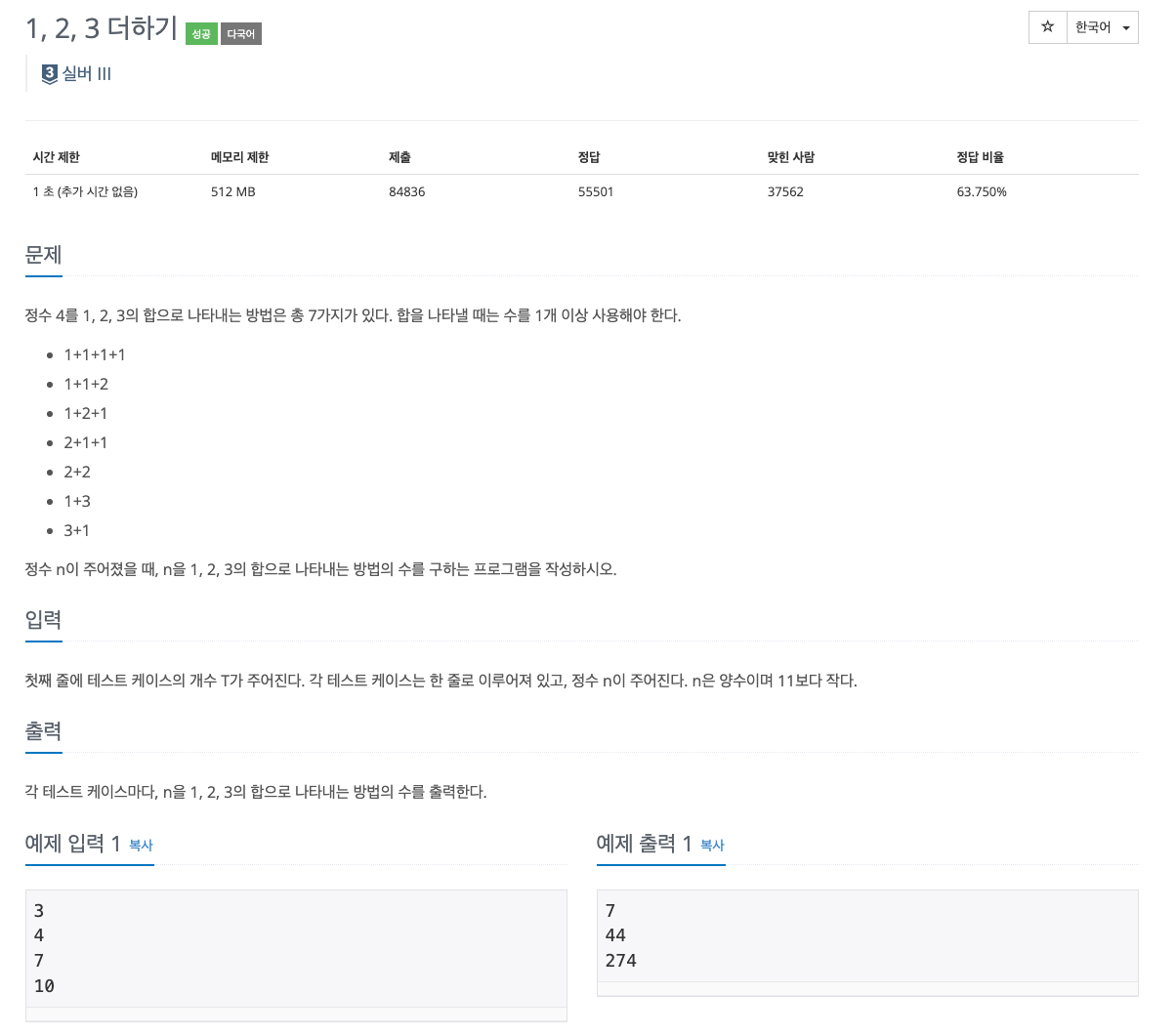 n에서 1, 2, 3을 빼고 남은 수를 다시 1, 2, 3의 합으로 나타내면 n을 1, 2, 3으로 나타내는 방법의 수를 알아낼 수 있다.