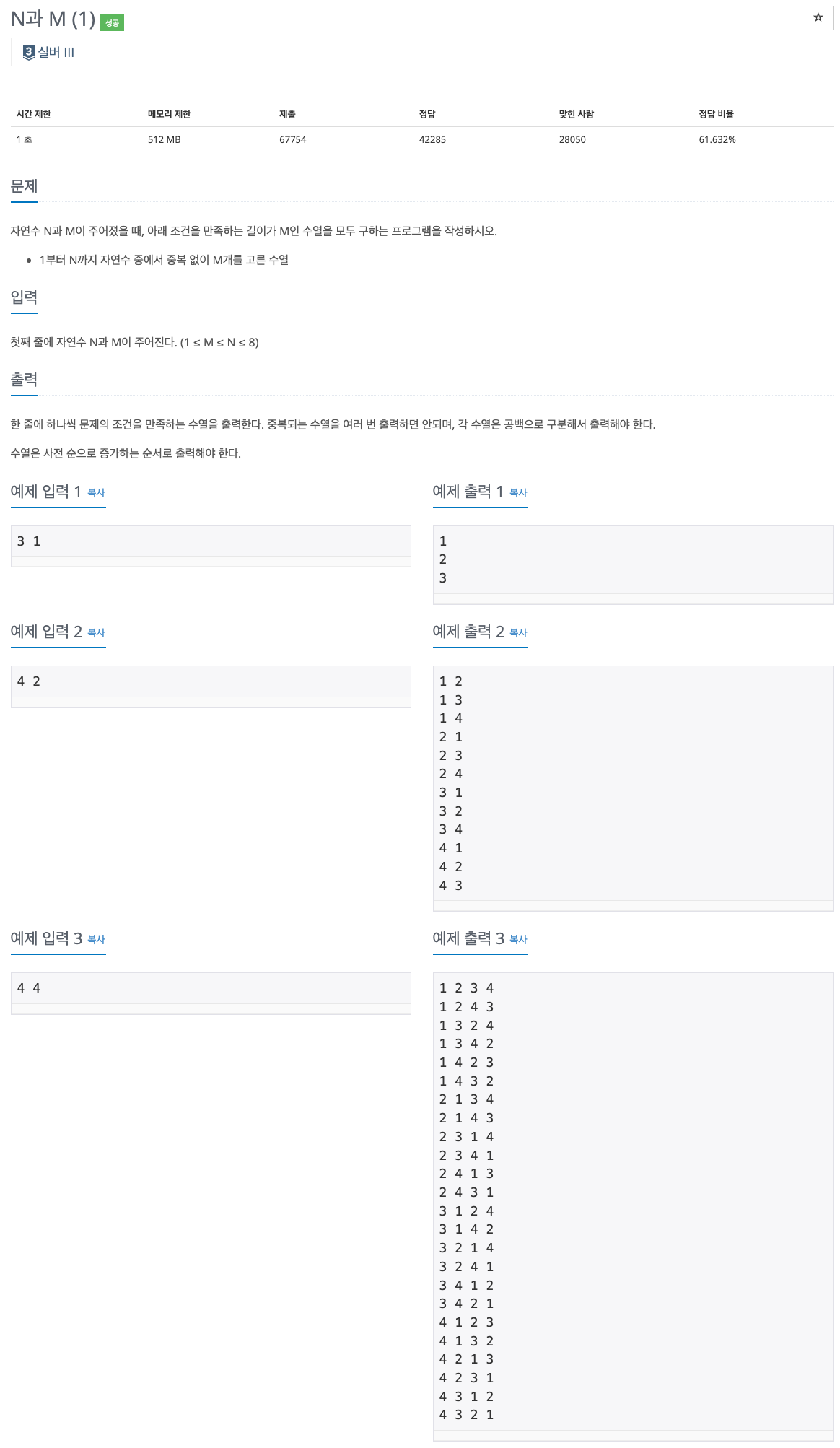 한 줄에 하나씩 문제의 조건을 만족하는 수열을 출력한다. 중복되는 수열을 여러 번 출력하면 안되며, 각 수열은 공백으로 구분해서 출력해야 한다. 수열은 사전 순으로 증가하는 순서로 출력해