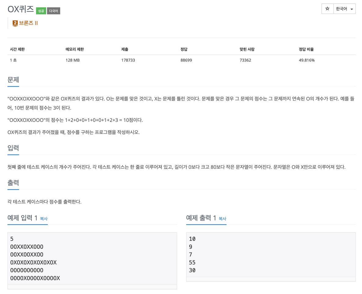 "OOXXOXXOOO"와 같은 OX퀴즈의 결과가 있다. O는 문제를 맞은 것이고, X는 문제를 틀린 것이다. 문제를 맞은 경우 그 문제의 점수는 그 문제까지 연속된 O의 개수가 된다. 예를 들어, 10번 문제의 점수
