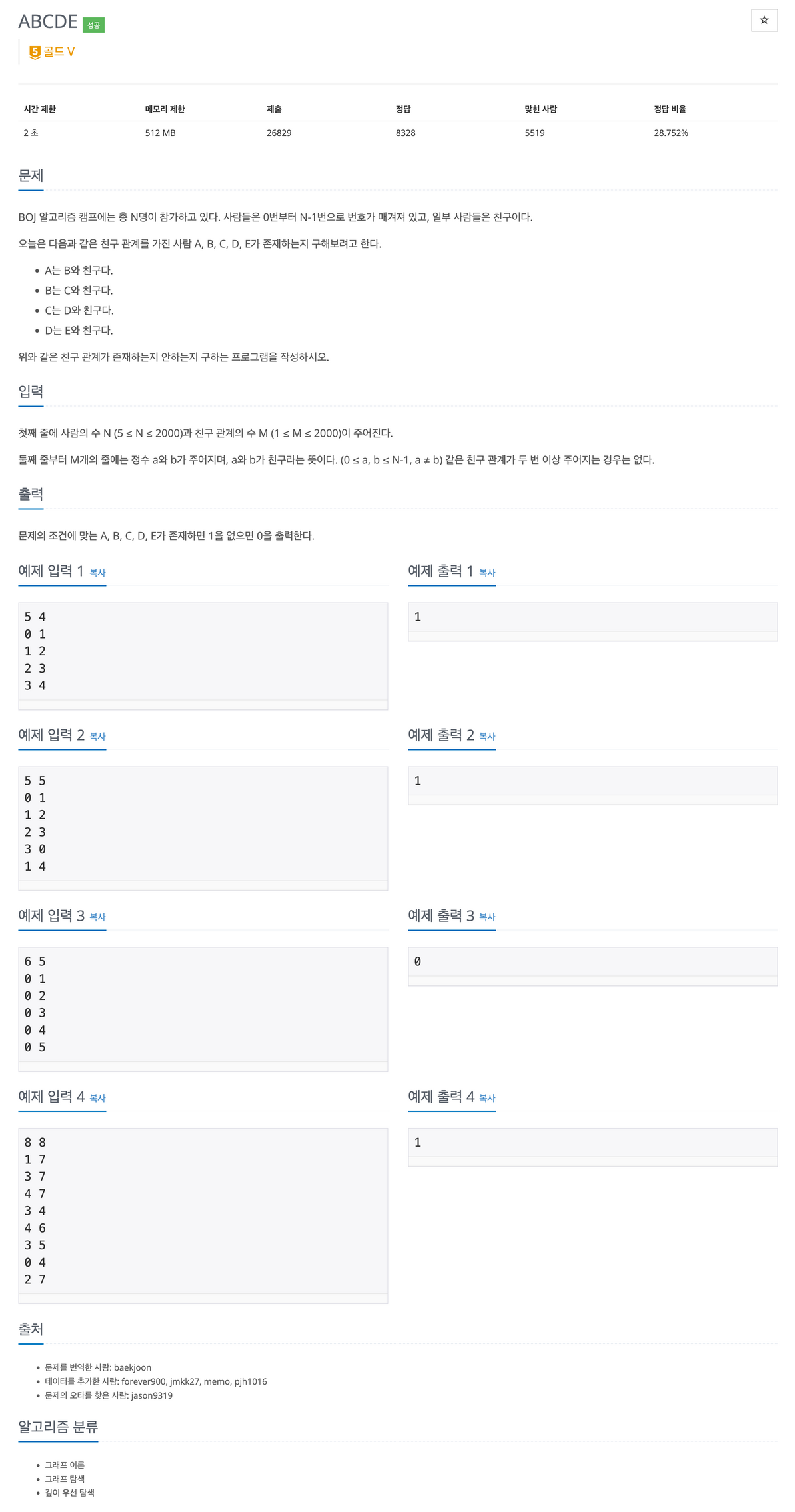 이 문제는 DFS를 통해 길이가 5인 경로가 존재하는지 확인하는 방법으로 해결할 수 있다.