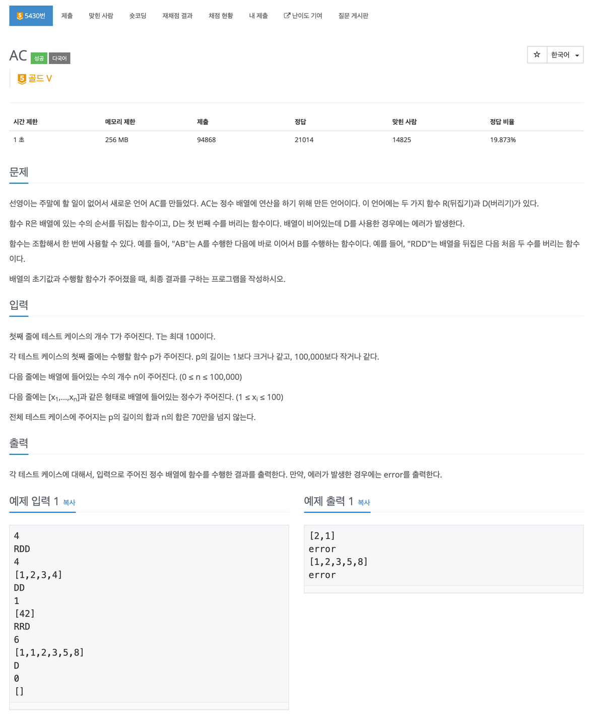 처음에 자료구조를 스택으로 하고 R과 D에 대응하는 메서드를 직접 작성했는데 시간초과가 발생했다.