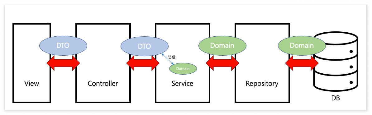 Controller에서 Service로 넘겨줄 때 DTO를 Domain으로 변환한다. Service에서는 Domain 객체를 사용해서 서비스를 수행한다.