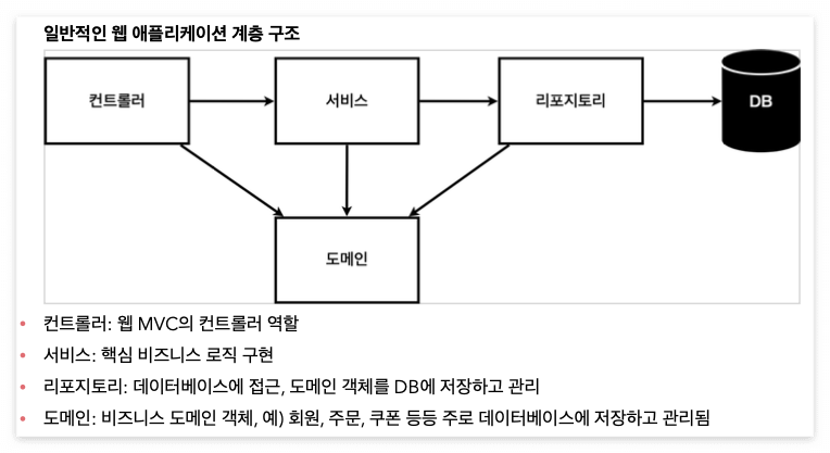 웹 어플리케이션의 계층 구조는 위와 같다. 이 중에 도메인 객체가 좀 생소하기도 하고 DTO와 Domain의 차이가 무엇인지 궁금해져서 자세하게 알아보기로 했다.