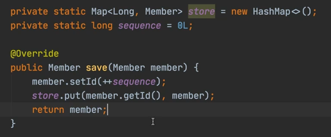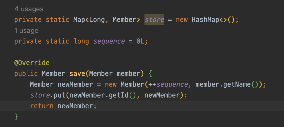 store에 id를 증가시키고 그만인 거면 store.put(++sequence, member)이라고 하고 말았겠지만 반환 값으로 id가 들어간 객체를 반환을 해줘야 했다. 그래서 newMember라는 임시 객체를 만들어주고 그 안에 생성자로 id를 넣어서 반환했다.