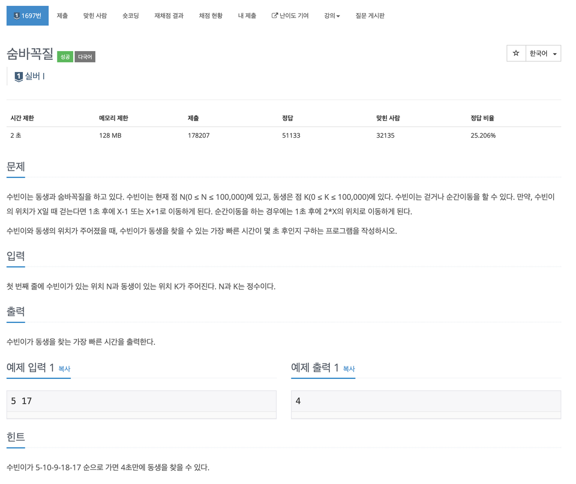 수빈이는 동생과 숨바꼭질을 하고 있다. 수빈이는 현재 점 N(0 ≤ N ≤ 100,000)에 있고, 동생은 점 K(0 ≤ K ≤ 100,000)에 있다. 수빈이는 걷거나 순간이동을 할 수 있다. 만약, 수빈이의 위치가 X일