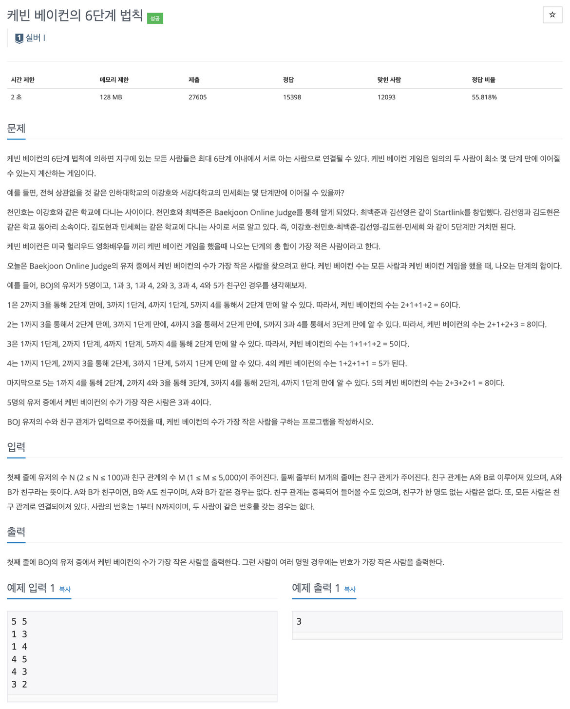첫째 줄에 유저의 수 N (2 ≤ N ≤ 100)과 친구 관계의 수 M (1 ≤ M ≤ 5,000)이 주어진다. 둘째 줄부터 M개의 줄에는 친구 관계가 주어진다. 친구 관계는 A와 B로 이루어져 있으며, A와 B가 친구라는 뜻