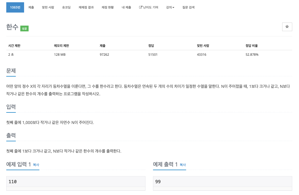 - 100미만인 수는 모두 한수이기 때문에 입력이 한자리 수, 두 자릿수 일 때를 한 번에 묶어서 처리해도 됨