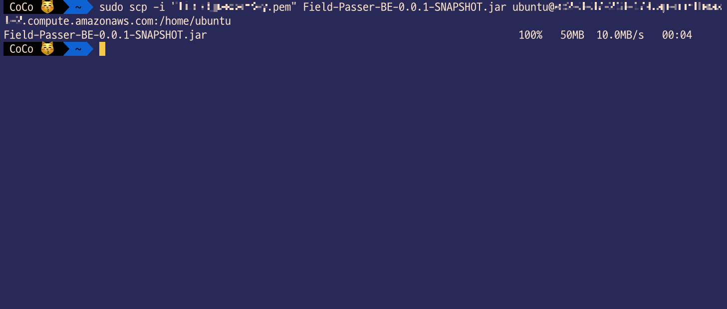 마찬가지로 scp 명령어를 사용해서 서버로 jar 파일을 보내줍니다.