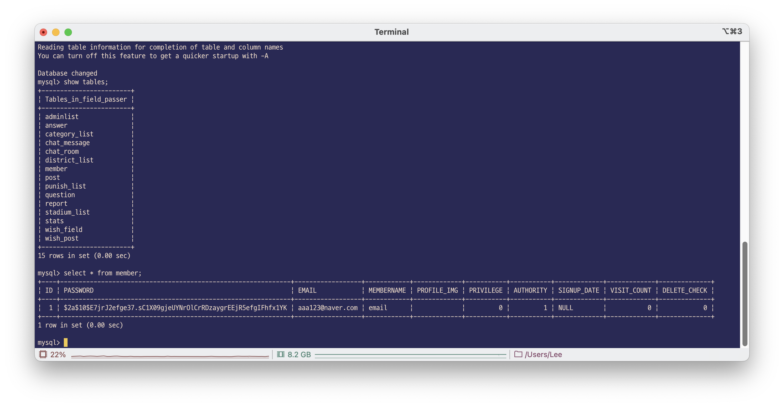 회원가입을 시도하니까 DB에 회원 정보가 저장된 것을 확인할 수 있습니다.