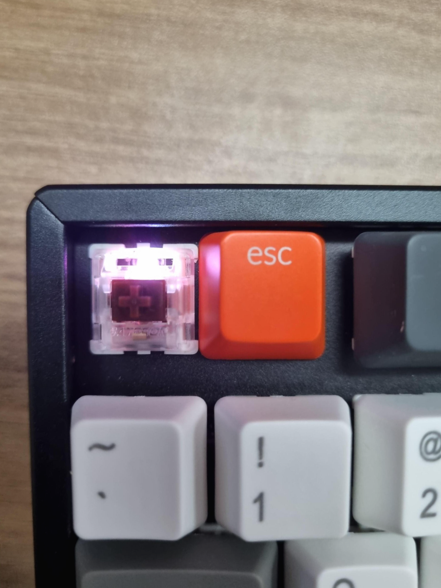 스위치가 역방향으로 채결되어 있는 이유는 LED의 방향과 키캡에 있는 글자 부분의 위치를 맞추기 위해서예요. 이렇게 해야 LED 효과를 극대화할 수 있기 때문이죠.