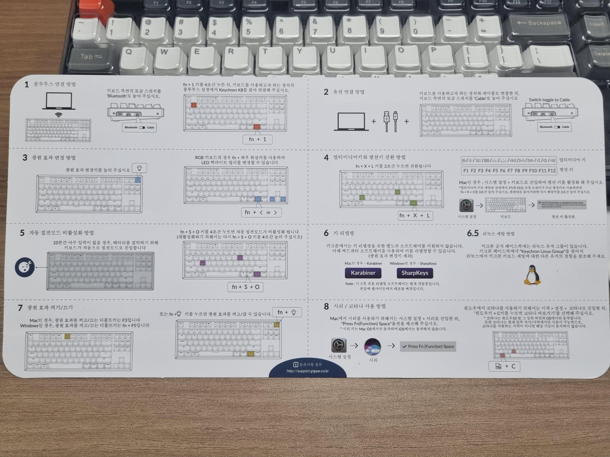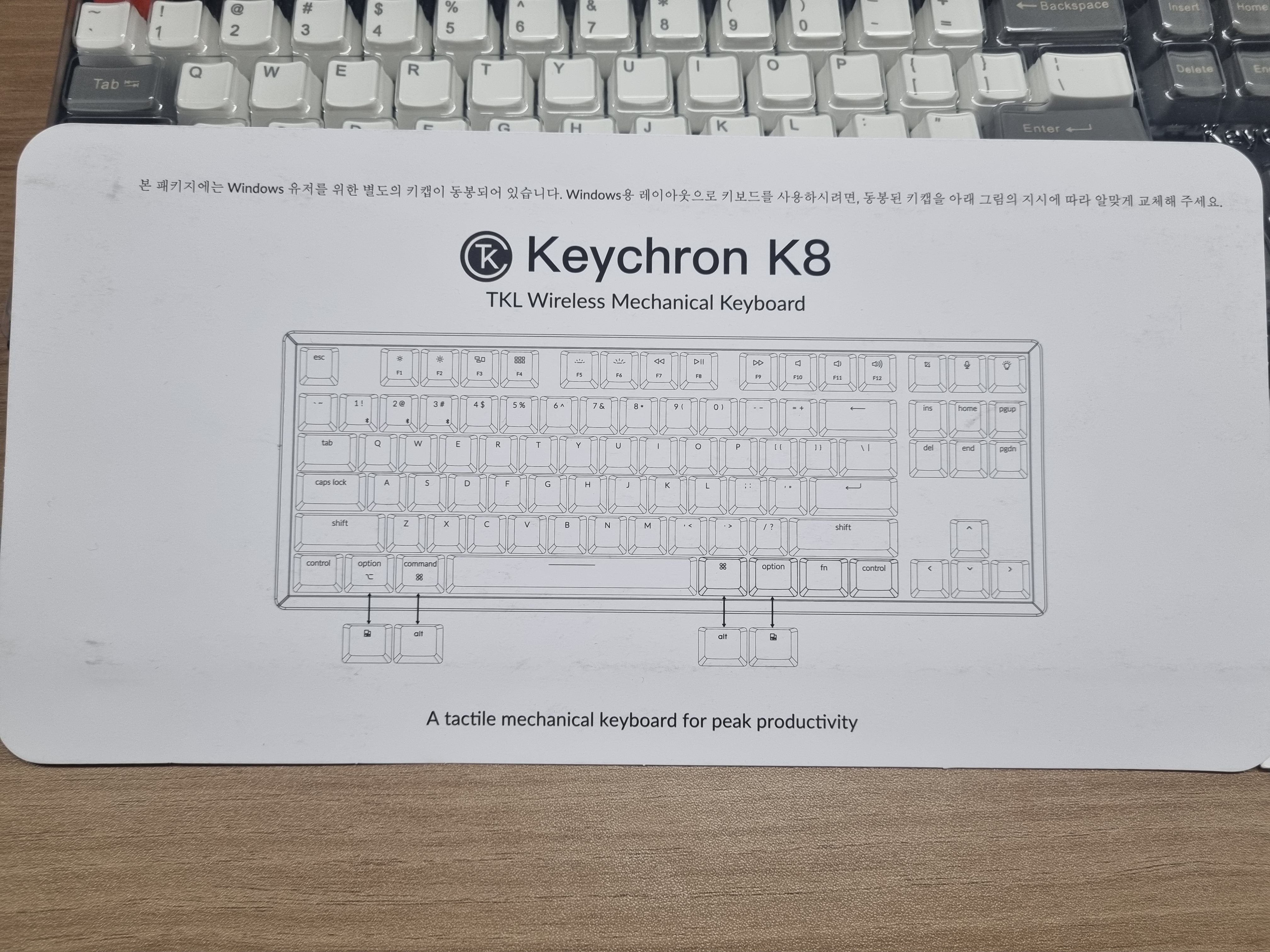 Windows 사용자를 위해서 저렇게 별도 키캡(오른쪽 사진)이 따로 제공됩니다. 간편 사용 설명서(왼쪽 사진)의 안내에 따라 키캡을 변경하시면 Windows 모드로 변경할 수 있어요.