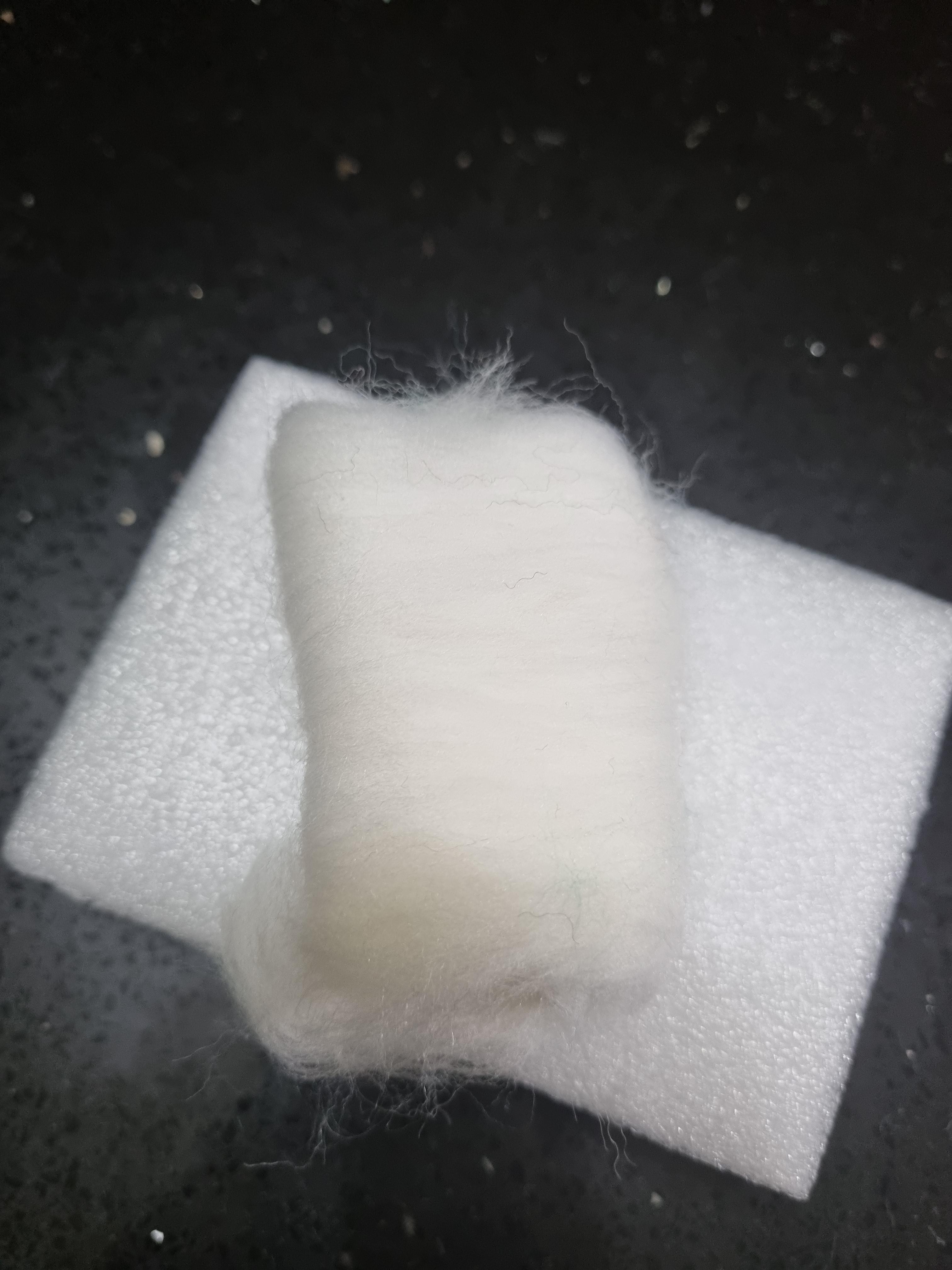 흰색 털을 적당량 뜯어서 스티로폼 블록 위에 올려두고 바늘로 찔러준다. 이때, 바늘이 들어가는 방향과 나오는 방향이 같아야 예쁘게 만들어진다고 한다.