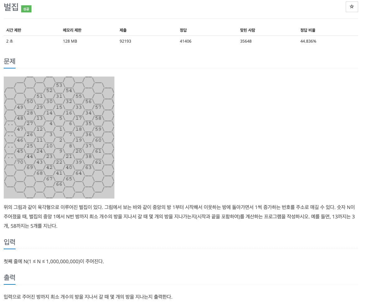 위의 그림과 같이 육각형으로 이루어진 벌집이 있다. 그림에서 보는 바와 같이 중앙의 방 1부터 시작해서 이웃하는 방에 돌아가면서 1씩 증가하는 번호를 주소로 매길 수 있다. 숫자 N이 주어졌