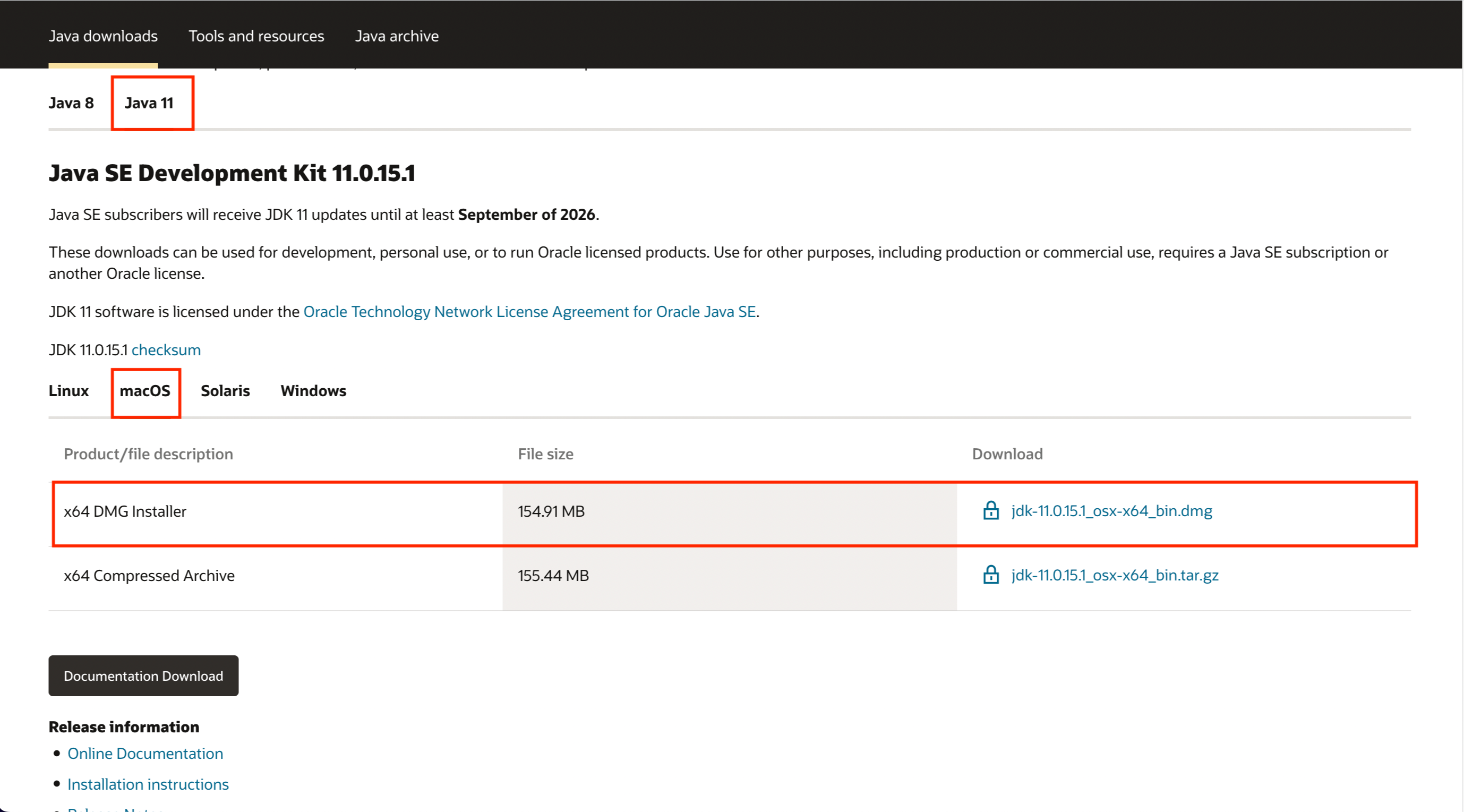 위 링크를 타고 오라클 홈페이지에 들어가서 설치하고자 하는 Java 버전을 다운로드한다. 나는 Java 11을 설치할 것이라 macOS용 DMG 설치 파일을 다운로드하였다.
