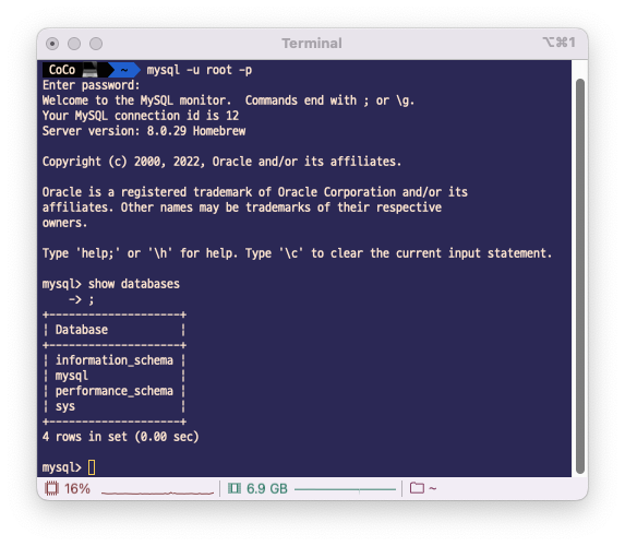 아래 명령어로 mysql을 접속한 뒤 아까 설정한 비밀번호를 입력하면 정상적으로 작동하는 것을 볼 수 있다.