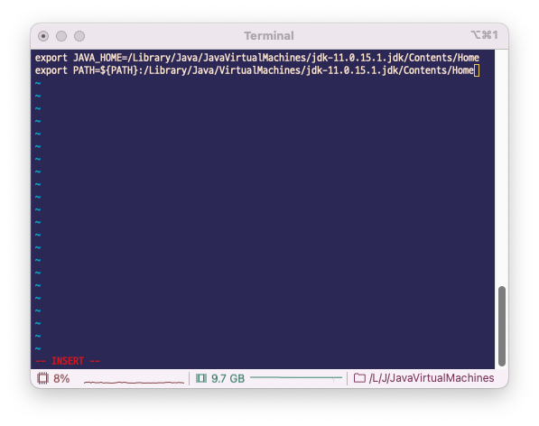 터미널을 열고 vi ~/. bash_profile로 파일을 생성한 뒤, i를 눌러서 입력 모드로 변경한다.