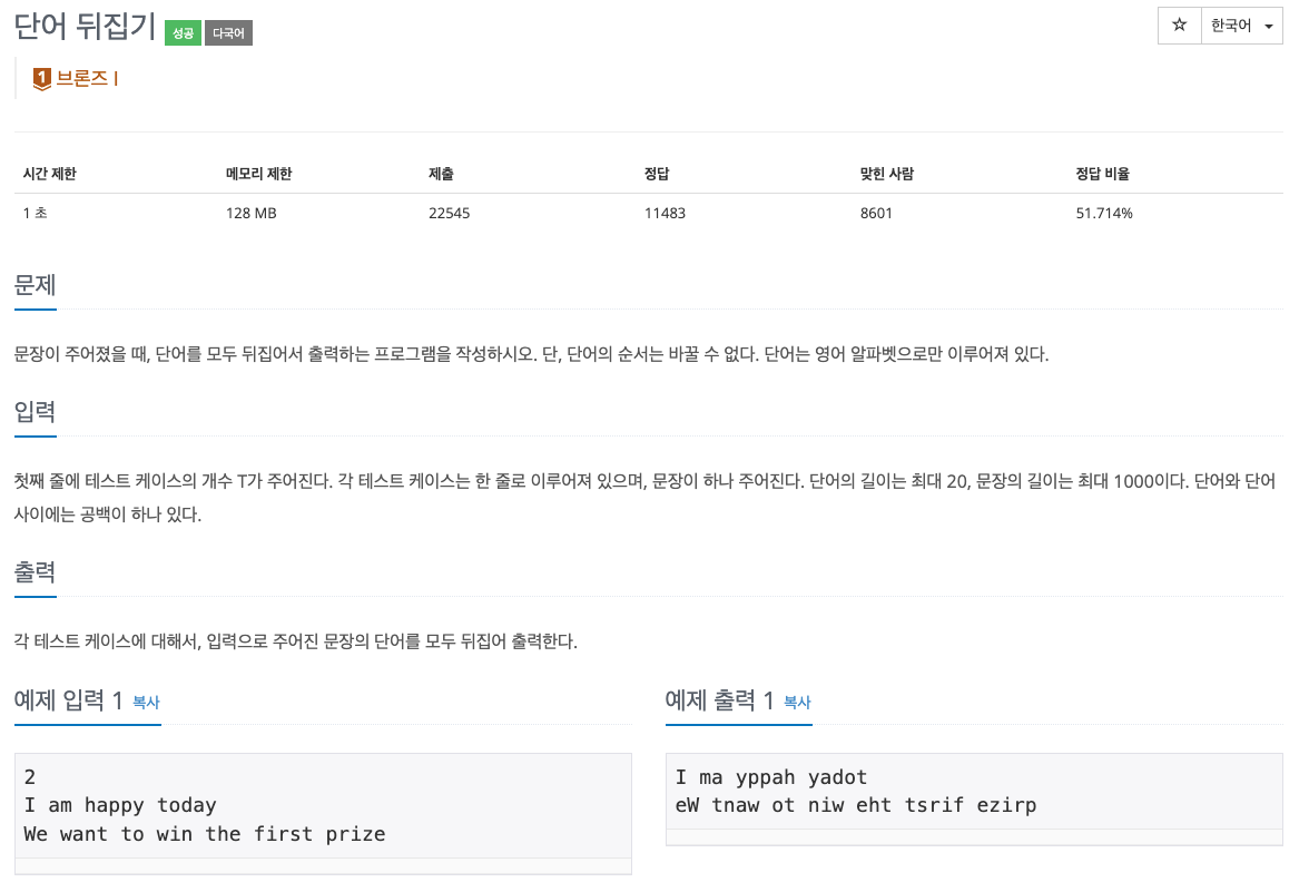 첫째 줄에 테스트 케이스의 개수 T가 주어진다. 각 테스트 케이스는 한 줄로 이루어져 있으며, 문장이 하나 주어진다. 단어의 길이는 최대 20, 문장의 길이는 최대 1000이다. 단어와 단어 사이에는