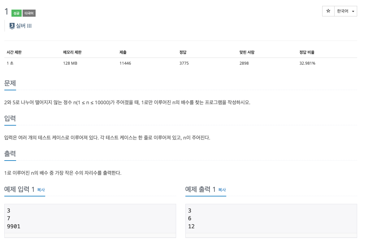 2와 5로 나누어 떨어지지 않는 정수 n(1 ≤ n ≤ 10000)가 주어졌을 때, 1로만 이루어진 n의 배수를 찾는 프로그램을 작성하시오.