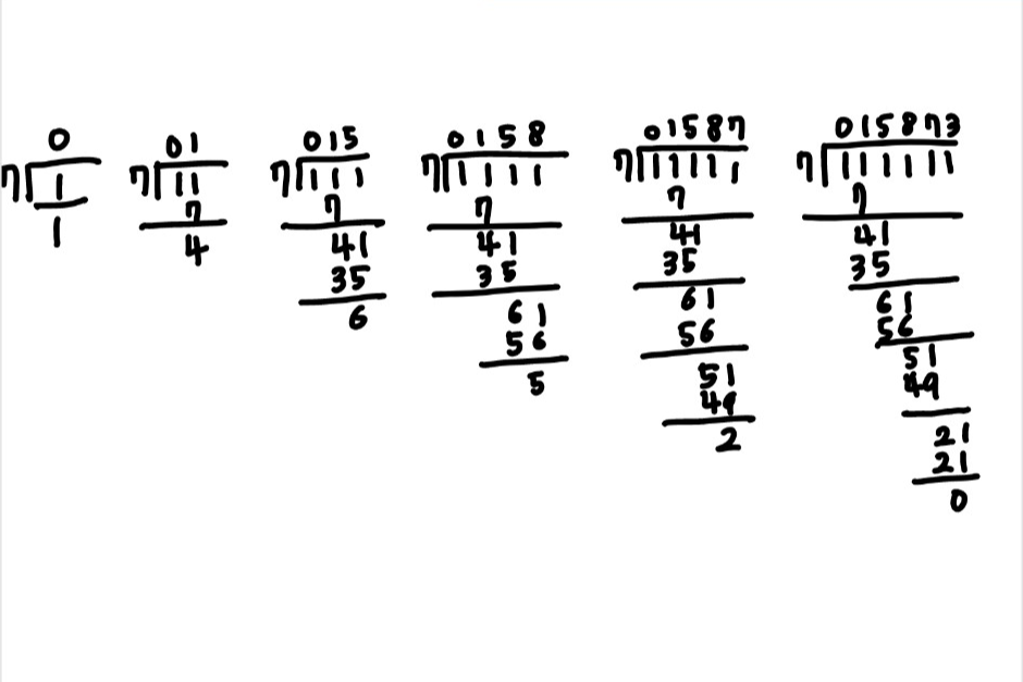 - 1111 % 7 = {(111 % 7) x 10 + 1} % 7 = (6 x 10 + 1) % 7 = 61 % 7 = 5