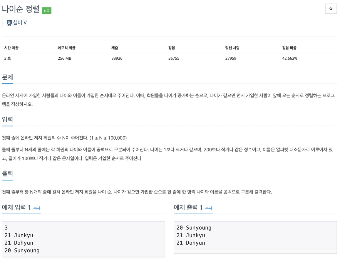 온라인 저지에 가입한 사람들의 나이와 이름이 가입한 순서대로 주어진다. 이때, 회원들을 나이가 증가하는 순으로, 나이가 같으면 먼저 가입한 사람이 앞에 오는 순서로 정렬하는 프로그램을