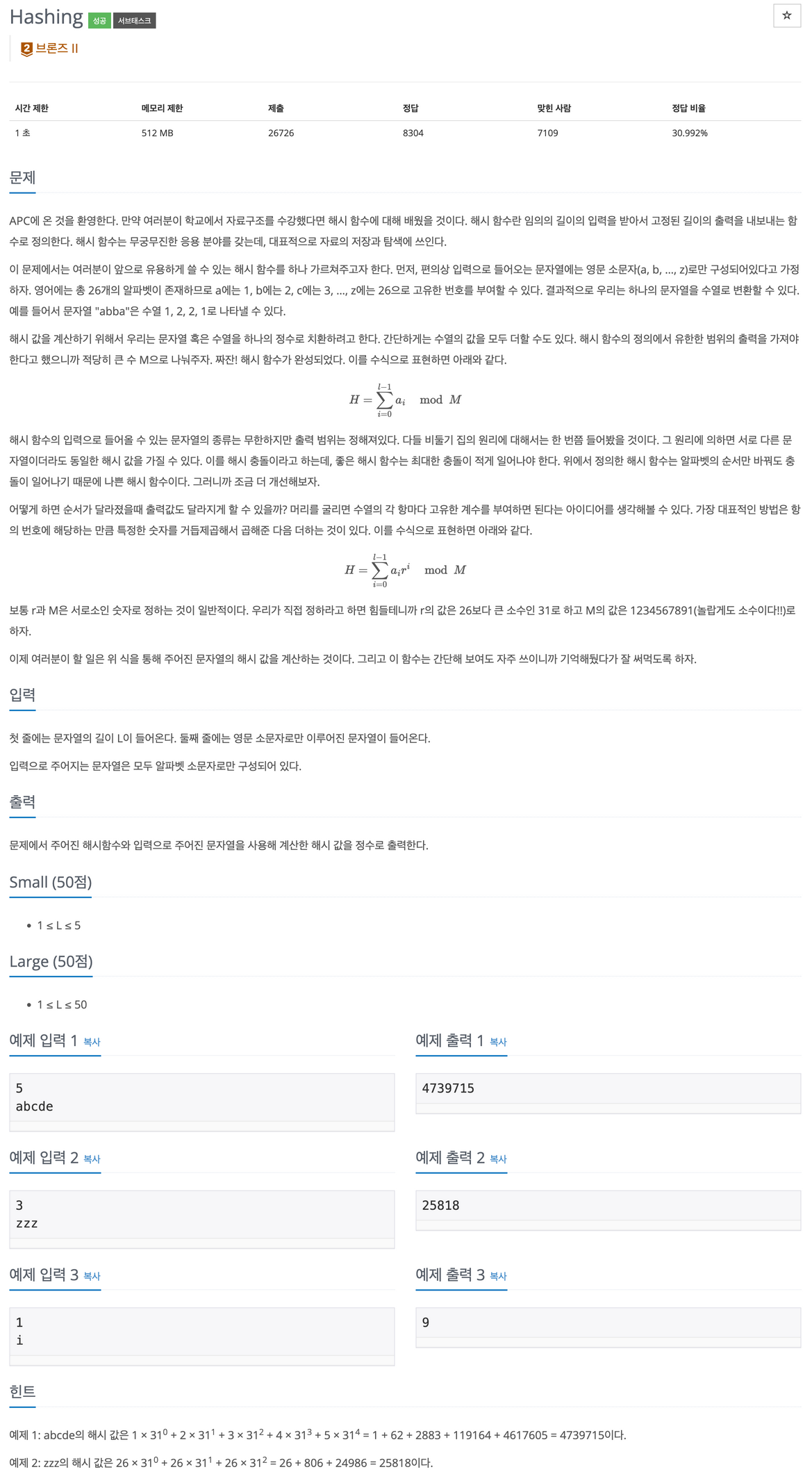 이 문제는 파이썬이면 아무 생각 없이 풀 수 있는 문제(파이썬은 수 범위가 무한이니까)지만 그 외 언어를 쓴다면 나머지 연산에 작업을 해주어야 한다. 그렇지 않으면 31⁵⁰이라는 엄청난 범위의 수를 담아낼 자료형이 없기 때문이다.